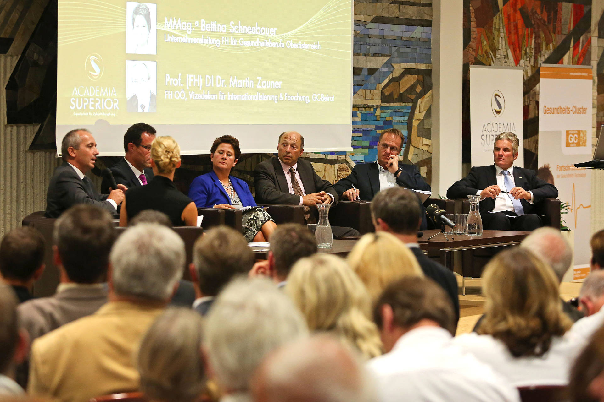 In der Talkrund mit Manfred Buchberger, MBA, CEO Greiner Bio-One Preanalytics, GC-Beirat, Mag. Michael Farthofer, GF AKAtech Produktions- und Handels GmbH, GC-Beiratssprecher, Univ.-Prof. Dr. Markus Hengstschläger, Humangenetiker, Wissenschaftlicher Leiter von ACADEMIA SUPERIOR, Mag. Karl Lehner, MBA, Vorstandsdirektor gespag, GC-Beirat, MMag.a Bettina Schneebauer, Unternehmensleitung FH für Gesundheitsberufe Oberösterreich und Prof. (FH) DI Dr. Martin Zauner, FH OÖ, Vizedekan für Internationalisierung & Forschung, GC-Beirat ging es um die Potenziale der Gesundheitswirtschaft in Oberösterreich. Dabei angesprochen wurden unter anderem folgende Punkte: