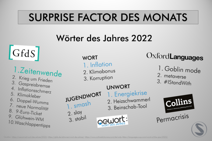 Jedes Jahr erheben verschiedene Institutionen im Rahmen von Einreichungen und Abstimmungsverfahren die „Wörter des Jahres“. Der Surprise fact gibt einen Einblick darüber, welche 2022 dazu ausgewählt wurden.